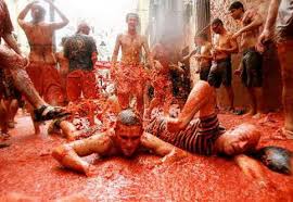 La Tomatina is a food fight festival held on the last wednesday of August each year in town called Bunol,Valencia of spain. More than ten thousand of participants come from all over the world to fight in a brutal battle where more than hundred metric tons over-ripe tomatoes are thrown in the streets.One night before the tomato fight, participants of the festival compete in paella cooking contest. it is a tradition of the women to wear all white and the men to where no shirts. This festival started in a casual way in 1945,but wasn't officially recognized untill 1952. In preparation for the tomato fight ,the shopkeepers use huge plastic covers on their storefronts in order to protect them.At around 10 a.m,the first event of the Tomatina begins.This festival starts by figuring out how to get people to climb up a greased pole with a ham at the top.While this is happening the group works up a frenzy singing and dancing while being showered from hose.Once someone is able to release the ham from the pole,several trucks haul tons of tomatoes.The signal for the begining of the fight is firing of water cannons,and chaos begins.Once it begins,the battle is generally every man for himself.Those who take part in this event are encouraged to wear a proctective goggles and gloves.The participants must even squish the tomatoes before throwingfor safety precautions.After exactly one hour ,the fighting ends when the water cannons are fired once more to signal the end.At this point,no more tomatoes can be thrown.This tomato war end by cleaning process,which involves the use of fire trucks to spray down the streets.......THE END......